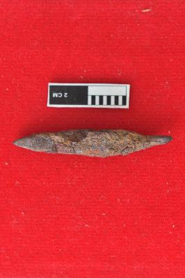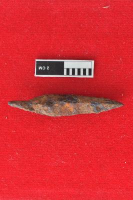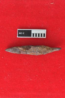 | Description / विवरण | It is a rusted arrowhead with a pointed head. Its square in shape, A small tail is also seen in it probably for fixing it in shaft. |
