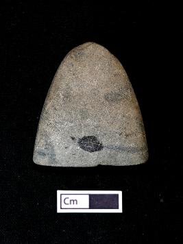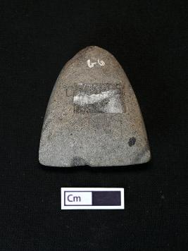 | Description / विवरण | A celt, made on basalt with broad cutting edge. It is triangular shaped with partly chipped off on edge and it has oval cross section. |