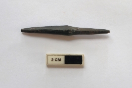| Description / विवरण | A bone arrow head. It is black in color and both tip points are partially broken. |