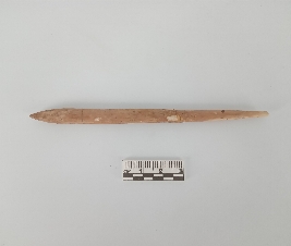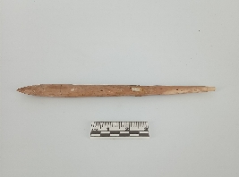 | Description / विवरण | A slender, elongated bone pin most likely to be an awl. It has tapering towards one end, giving it a pointed tip, while the other end is slightly broader and flatter. The surface appears yellowish and shows signs of wear, smoothing, and some small pitting, consistent with long use and age. |