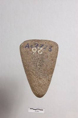 | Description / विवरण | Triangular shape object. Working area is expanded then but end portion. Cutting edge is convex and butt end is narrow and pointed. Surface is coarse. |