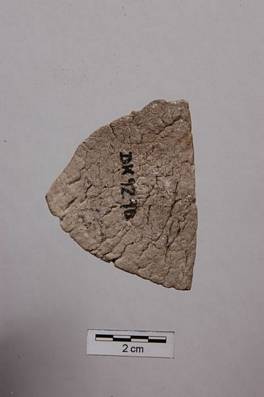 | Description / विवरण | Broken stone piece. Surface has crack marks. Object has thick edge on top below that portion is inwardly curved. |