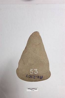 | Description / विवरण | Triangular shape object. Cutting edge is round and thin. Little above of cutting edge there is inward curve in both sides. Butt end portion narrower and pointed. Surface is moderately polished. |