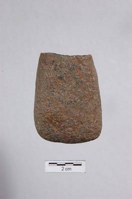 | Description / विवरण | Celt with convex cutting edge . Butt end portion is broken. Surface is coarse with orange colour patina. |