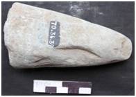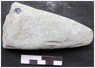 Flaked on the dorsal and ventral is little ground showing marks of chipping along lateral margins. The margins are rounded tapering towards the arched butt. Nearly elliptical in cross section with cortex all over on both the faces. The platform is uneven. The working edge is blunt which is oval in shape. It is concave on the right margin and tapers towards the left margin which is relatively thin. .