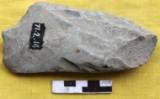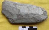 Made by flaking with small patches of cortex on both the faces. The margins are thick and worked showing marks of flaking. The right margins are concave. The working edge is partly broken from the left. Worked pointed butt. Ovoid in median and lenticular in longitudinal sections. The tool is made by flaking technique.