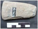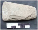 Bifacially flaked with two flat surfaces. Lateral margins are marked with small steps. The edge is bifacially ground. Edge line is convex and sharp. The butt has an elliptical poll. Biconvex in median section and sub-triangular in longitudinal cross section. The working edge tapers from both sides. Both the sides are trimmed by removing small flake scars. Patches of cortex are noticed on both the faces.
