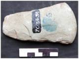 Bifacially flaked with marks of pecking on the ventral face and chipping along the lateral margin which are concave. The edge is ground and little splayed with edge line being convex. Butt is thin and straight. Elliptical median and biconvex longitudinal sections. The tool retains a patch of cortex on the ventral as also on the dorsal near the cutting edge.