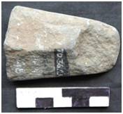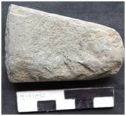 Bifacially flaked with a deep flake scar on the ventral. Marks of chipping along the left margin. Butt is narrow with a triangular poll. The ventral is slightly conical. The dorsal remains flat. The working edge is roughly roundish due to excessive use. The platform is flat. The ventral has a triangular shape from the platform to the body.