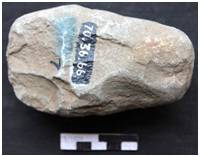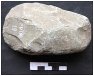 Made by flaking on both the faces with cortex covering the left margin on the dorsal surface. Almost right half of the ventral face is also covered by cortex. Right margin is thick and alternately worked. The working edge is also thick and showing marks of utilization. Irregular in median section. Triangular in longitudinal section. The platform is uneven.