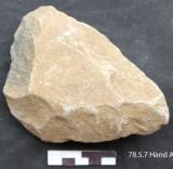Bifacially trimmed along both the sides which converge at the anterior. The scars are small with deep scar on the dorsal. Small steps at the right anterior. Cortex in the middle with a natural flake at the butt. Ventral has small and shallow scars. A patch of cortex in the middle extending to the left. Natural flaking at the butt with a pointed tip. Straight butt. Indeterminate median and longitudinal sections.