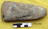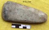 Ground all over, retaining a bold fracture on the under. Both the sides are flat. Curved from ventral and dorsal is beveled at the edge. Butt is thin with a straight poll. Lateral margins are flat. Edge line is convex. Rectangular in cross-section. Both the faces retain patch of cortex. Both the end are straight and pointed.