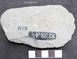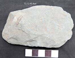 Roughly ground all over ventral is little convex and dorsal is flat with beveling at the cutting edge. Margins are flat and roughly ground. Butt is irregular. Quadrangular in median section. Triangular in longitudinal section.