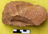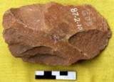 Dorsal is alternately worked along left upper and proximal. A scar at the distal end. Rest is cortex. Ventral has a mid-ridge. A big step in the left side. Right side is flat. The tool is slightly concave on the ventral whereas the dorsal has been flaked extensively. Marginal sections are thin and sharp. The tool is undulating and crude in workmanship.