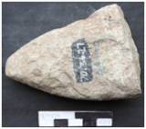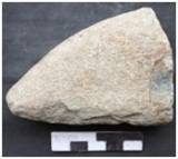 Flaked on the ventral. Retaining cortex on the dorsal. Right margin is ulternately flaked. Left margin is thick, roundish. The butt is pointed. The right margin is trimmed from both the faces. The dorsal is slightly parallel. The ventral is convex due to removal of a large and bold flake scar. The left margin is roughly oval. The right margin is parallel. The tip of the tool is grounded due to excessive use.