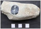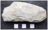 Bifacially all over with a patch of cortex on the ventral. The platform is uneven and a few bold scars have been removed. The working edge is sharpened by removing a few flake scars. The ventral is slightly flat. The dorsal remains slightly concave. The tool is heavily patinated. The tool retains used marks on the working end.
