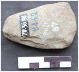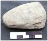 Partly ground on both the faces with scars of flaking along the lateral sides. The margins are roughly smooth, roundish and little convergent. Both the faces taper to intersect at the working end which has a convex edge line. Butt is thick with a worked and irregular poll. Median section is ovoid and longitudinal is triangular in shape. The tool is grinded and retains cortex on the ventral face. The sides are trimmed on the left margin on the working edge.