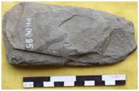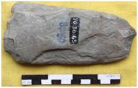 Fully flaked on both the faces retaining shallow and bold scars with a patch of cortex on the dorsal face. The working edge is symmetrically convex. Butt is thin and arch like with straight and worked margins. Elliptical in median cross section. Longitudinal section is biconvex. Both the margins are straight and tapering in nature. Heavy utilization mark on the working edge.