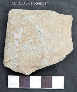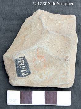 It is a flaked tool and is notched on one side to get a sharp edge. The section is relatively flat and is concave on the ventral and convex in the dorsal. It is retouched to get a sharp working edge. The tool is irregularly made but retains use mark on the top right end of the tool.