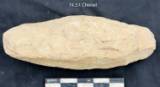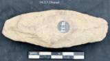 Flaked allover retaining large and heavy flake scar on the ventral. The sides are relatively uneven. The tool is heavy and unwieldy. The ventral retains a flat patch with sides trimmed. The ventral is concave and dorsal is relatively flat and undulating.