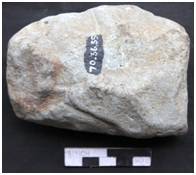 Flaked on both the faces. The margins are thin and straight in median cutting edge. The edge is convex and blunt. It is roughly made by removing deep and large flake scars. A thin patch of cortex near the working edge on the ventral. The tool slats towards the working edge on the ventral. Heavy and deep flaked marks on the dorsal may be intended to make it as a side scrapper. The tool retains utilization marks.