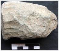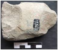 Bifacially flaked with deep flake scars. The sides are flaked. A patch of cortex on the ventral on the left margin. It is relatively flat on the ventral. The dorsal is undulating. The cutting edge is multiply flaked by removing large and bold flake scars. The platform is flat and is flaked from both the sides along with the left margin. The tool is heavily rolled and patinated.