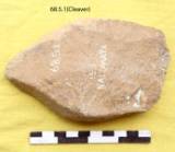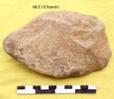 Bifacially worked with two primary flakes removed from the dorsal. One flake intersects the ventral to form the cutting edge. Ventral shows big flakes all over with trimming along the left lateral margin. Steps along the left side and has a pointed butt. Nearly straight edge retaining marks of utilization. Sub triangular in median section. The left margin is flaked and the right is rolled.
