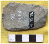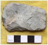 Bifacially flaked all over with marginal flake scars. Both the margins are thin, straight and chipped. Dorsal face is flat. The edge is thin and convex with marks of natural damage. Butt is straight with a plano-convex poll. The tool has a flat striking platform. The working edge is sharpened from both the sides with heavy utilization marks. The right section is sharp and left is blunt.
