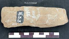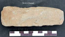 Shaped by flaking all over retaining patches of cortex on the body and working end on the ventral surface. Thick and massive lateral margins. Working end is beveled from dorsal surface. Dorsal face is concave. Butt is thick with a triangular poll. Median section is square.