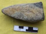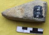 Roughly ground with central notches on the lateral sides retaining two shallow and slopping shoulders. Both the faces tapper and intersect at the thick and narrow edge with straight edge like retaining marks of use. The ventral end is thick, flat and rectangular showing marks of battering.