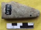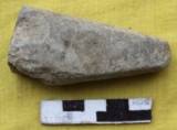 Broken butt. Ground all over with a pointed end showing marks of battering on the poll. The margins are thick, flat and smooth. The tool tappers slightly towards the working edge by removing small and tiny flake scars all over. The tool has a flat cross-section and is uneven on both the faces.