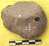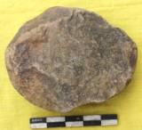 Dorsal has primary flaking at the right side and secondary trimming along the left with a concave on the margin. A big patch of cortex from anterior to posterior. Ventral has a flaked surface. A big step at the bottom right. Marks of battering along the margins. obliquely prepared butt. Thickly pointed tip. Slightly wary margins. triangular in median and elliptical in longitudinal sections.