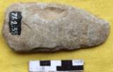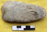 Partly ground. Both the faces retain few flake scars. Ventral is convex and dorsal is concave with leveling at the edge. The margins are moderately thin with traces of flaking. The right margin is straight and left margin is slightly convex. Butt is narrow and thin showing marks of battering. Working edge is sharp and convex with marks of natural damage.