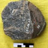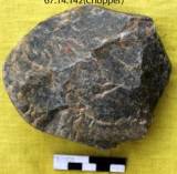 Dorsal has a slanted worked upper half with big primary scar and a small scar. Lower half retains cortex. Butt is unworked. Ventral extensively flaked. A bold flaking on the upper half. All other scars are flat and long. Three relatively small scars along the working edge. Working edge is thick and convex. Crude workmanship and the tool is uneven.