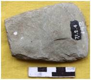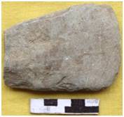 Bifacially flaked retaining cortex on the body. Edge is ground on both the faces with a sharp and convex edge line. Margins are little convex and thin showing marks of flaking. The butt is broken. Elliptical in median section and longitudinal section is triangular. It is prepared in flaking technique.