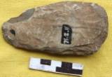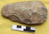 Unifacially flaked with cortex on the ventral surface. The margins are slightly convex showing traces of alternate flaking. The butt is thin and sharp retaining marks of natural damage. Edge is longitudinal and elliptical median cross section. The technique is flaking.