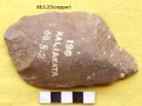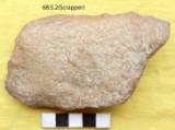 Unifacially worked. The dorsal shows trimming at the top and right bottom. Ventral is a flat flake surface. The ventral is concave and the dorsal is flat. The sides are flaked and trimmed to obtain the cutting edge. It is slightly concave on the upper and flat on the dorsal. A patch of cortex on the ventral. A triangular cut mark near the section. The tool contains use mark.