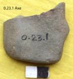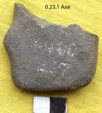 Ground all over with a waist on the left margin. Both the faces are flat. Right lateral margin shows beveling. Poll is rectangular. Heavily grounded with uneven cross-section in the right margin. The platform is flat and thin with a straight margin.