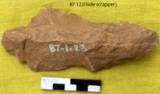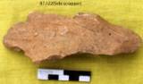 Worked on ventral surface. The scars are slopping down to the sides retaining a mid-ridge. Proximal is thin and arch like. Distal shows a tang like portion. It is roughly concave in the dorsal and conical on the ventral. The tool is heavily used and retains worked out working edged. The tool has a rough and undulating sides with cut marks.