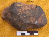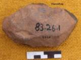 Trimmed to a triangular form. Bifacially worked and the dorsal has irregular flaking. The scars are flat and small. A bold step along the right central ridge from tip to butt. Secondary trimming at the working end. Central has two bold flake scars on two sides. Centrally elevated. Butt is thin and worked and has irregular margin.