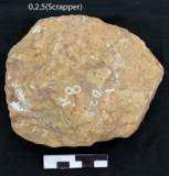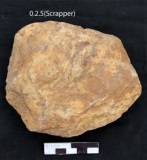 Bifacially worked to an irregular form retaining facial modification. The dorsal is worked along the periphery living a central elevation of cortex. Steps are all over the body. Left lateral is trimmed to form the edge. Right side is thick, small and bold step at the margin and the working end. It has a plain butt.