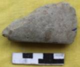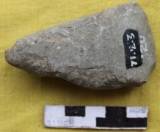 Reused as wedge ground with marks of chipping along the right lateral. Right margin is flat and smooth. It is renovated by flaking along the left lateral margin. The edge is thick and convex showing damages due to use. Butt is pointed. Median section is quadrangular and longitudinal is lenticular.