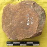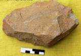 Unifacilly modified. The scars are big on the right side. Left shows small scars. A prominent mid-ridge till posterior. A patch of cortex at the anterior with unworked butt. Thin in section showing marks of utilization. Ventral is flat-flaked surface. Two deep scars along the left margin and the right margin are irregular. The tool is patinated brown and is used.