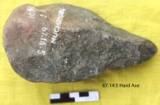 Bi-facially worked. Dorsal has two big scars along the right margin. Steps at the top and small flat scars at the right posterior. Left lateral shows a primary scar. Small steps along the upper left half. Mid-ridge is present antero-posteriorly. Butt is partly unworked. Ventral thoroughly worked with convergent facial modification. Centrally elevated and the butt is rounded and reduced. Thick regular margins. Diamond median and triangular longitudinal sections.