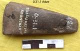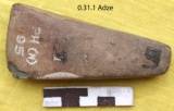 Bifacilly ground with a convex ventral surface intersecting with the flat dorsal surface at the cutting edge. The edge is beveled and slightly convex. The margins are ground flat showing a few traces of chipping on the right. Butt is narrow with a rectangular poll. Rectangular in median cross-section.