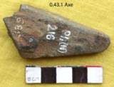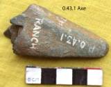 Roughly ground, broken from the body. Two sides tapper towards the butt. Poll is round and margins are flat. Heavily grinded. The ventral face is slightly concave and dorsal is flat. Left marginal section is sloppy. mRight margin is flat and straight. Roughly conical in the working end. The tool retains broken flake scars due to excessive use of the tool.