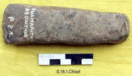 Bifacially ground showing marks of chipping at the butt. Under surface is flat. Ventral slopes to intersect the dorsal to form the cutting edge. Beveled on the dorsal surface. The edge line slightly convex showing marks of use. The lateral margins are little ground retaining tiny steps. The poll at the butt is oblique. It is rectangular in cross section.
