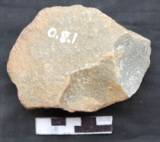 Flaking allover retaining small patch of cortex at the ventral and roughly a central ridge. Ventral shows a primary flat surface with a small and bold scar at the right side. Working end is broken. Convex butt with irregular section.