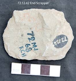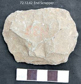 It is a scrapper chipped all over with a sharp edge in one end and relatively thick on the other. Large flake scars have been removed to get the working edge. The working edge is sharp and bifacially flaked.