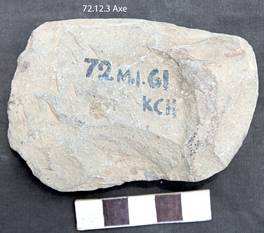Bifacially flaked with a thin and convex edge. Thick and convex butt. Right margin is straight and trimmed from the upper. Dorsal shows traces of pecking towards the cutting end. Dorsal shows step near the butt. Biconvex in median section and longitudinal is nearly lenticular.